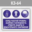 Знак «Перед работой проверь: наличие и исправность средств защиты и спасательного снаряжения», КЗ-64 (металл, 600х400 мм)