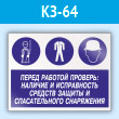 Знак «Перед работой проверь: наличие и исправность средств защиты и спасательного снаряжения», КЗ-64 (пластик, 600х400 мм)