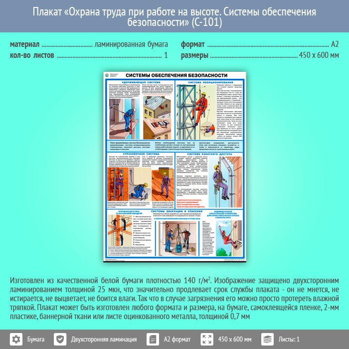 Плакат «Охрана труда при работе на высоте. Системы обеспечения безопасности» (С-101, ламинированная бумага, А2, 1 лист) в Химках купить