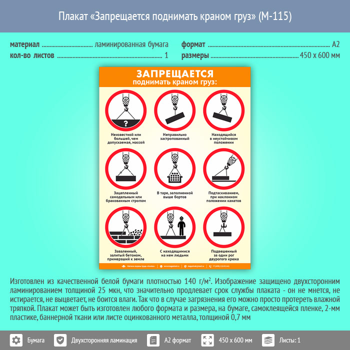 Плакат «Запрещается поднимать краном груз» (М-115, ламинированная бумага, А2, 1 лист) в Химках купить