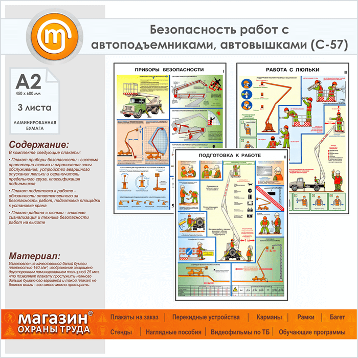 Плакаты «Безопасность работ с автоподъемниками, автовышками» (С-57, ламинированная бумага, А2, 3 листа) в Химках купить