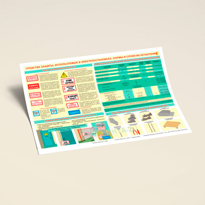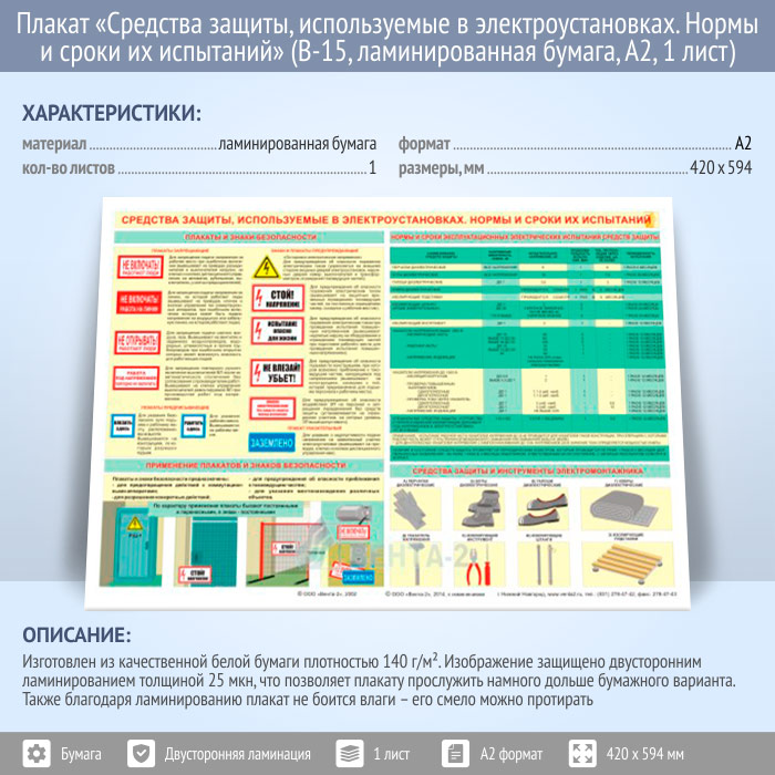 Плакат «Средства защиты, используемые в электроустановках. Нормы и сроки их испытаний» (В-15, ламинированная бумага, А2, 1 лист) в Химках купить