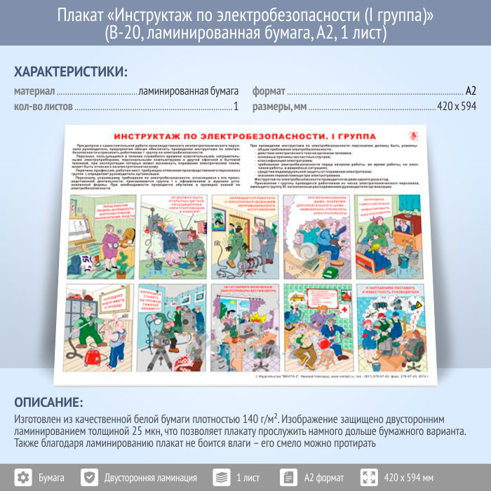 Плакат «Инструктаж по электробезопасности (I группа)» (В-20, ламинированная бумага, А2, 1 лист) в Химках купить