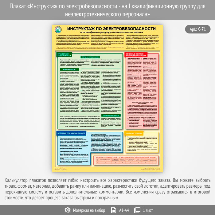 Плакат «Инструктаж по электробезопасности - на I квалификационную группу для неэлектротехнического персонала» (С-71, 1 лист) в Химках купить