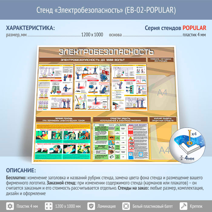 Стенд «Электробезопасность до 1000 вольт» с плоским и объемным карманами (EB-02-POPULAR) в Химках купить