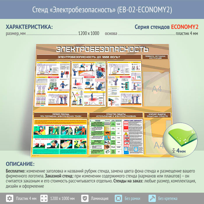 Стенд «Электробезопасность до 1000 вольт» с плоским и объемным карманами (EB-02-ECONOMY2) в Химках купить