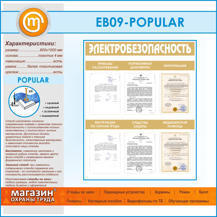 Стенд «Электробезопасность» с 6 карманами (EB-09-POPULAR) в Химках купить