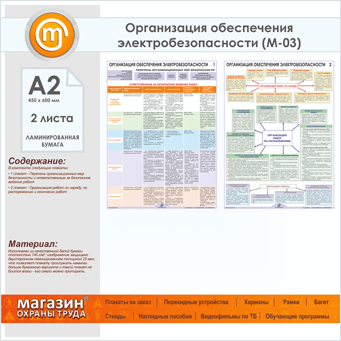 Плакаты «Организация обеспечения электробезопасности» (М-03, ламинированная бумага, А2, 2 листа) в Химках купить