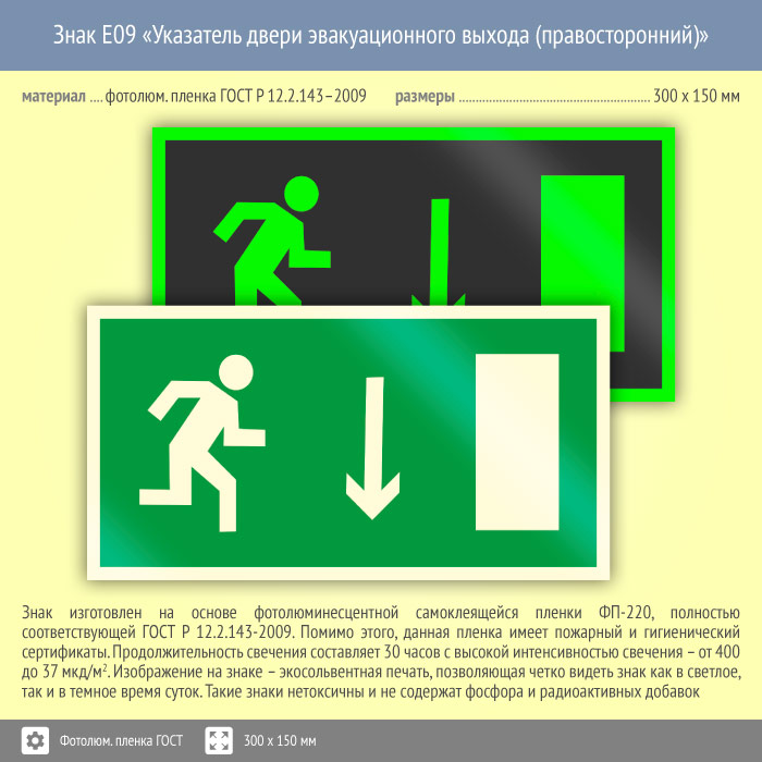 Знак E09 «Указатель двери эвакуационного выхода (правосторонний)» (фотолюминесцентная пленка ГОСТ 34428-2018, 300х150 мм) в Химках купить