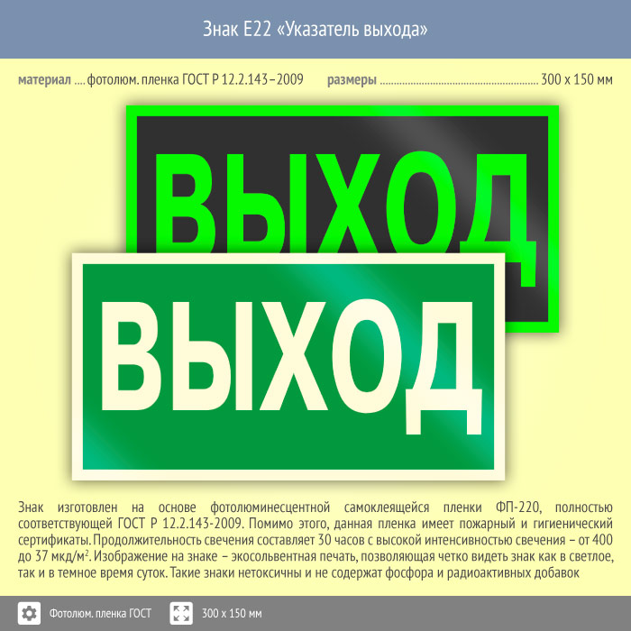 Знак E22 «Указатель выхода» (фотолюминесцентная пленка ГОСТ 34428-2018, 300х150 мм) в Химках купить