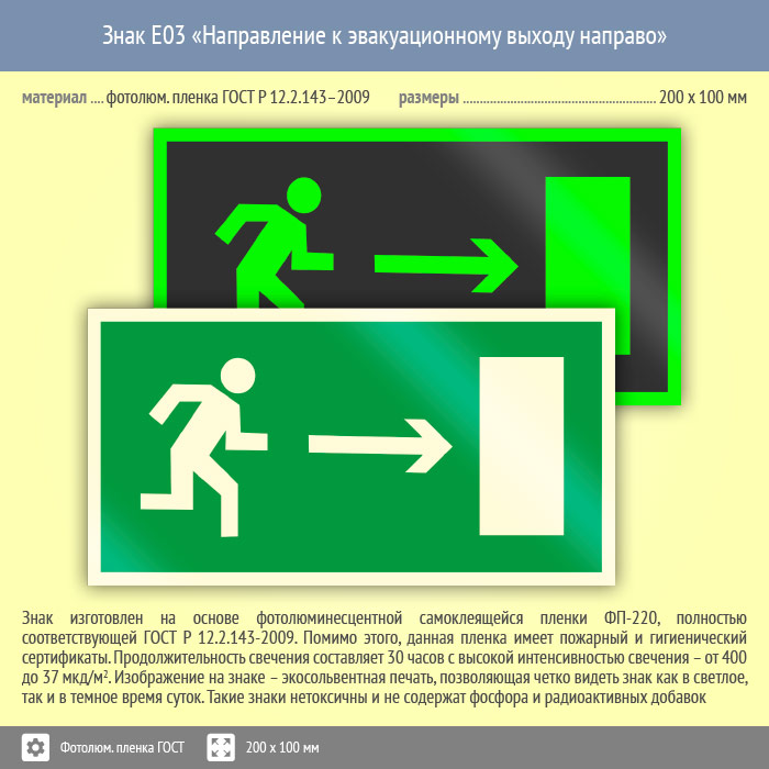 Знак E03 «Направление к эвакуационному выходу направо» (фотолюминесцентная пленка ГОСТ 34428-2018, 200х100 мм) в Химках купить