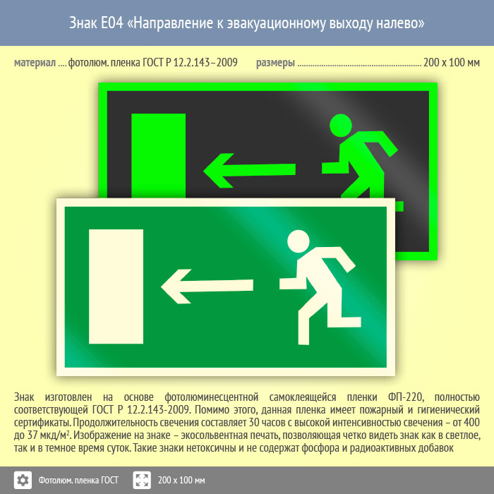 Знак E04 «Направление к эвакуационному выходу налево» (фотолюминесцентная пленка ГОСТ 34428-2018, 200х100 мм) в Химках купить