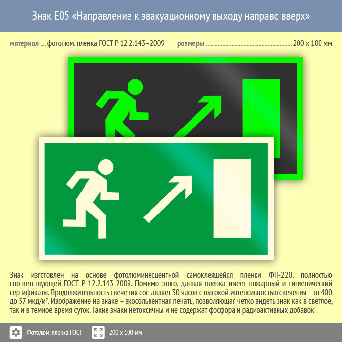 Знак E05 «Направление к эвакуационному выходу направо вверх» (фотолюминесцентная пленка ГОСТ 34428-2018, 200х100 мм) в Химках купить