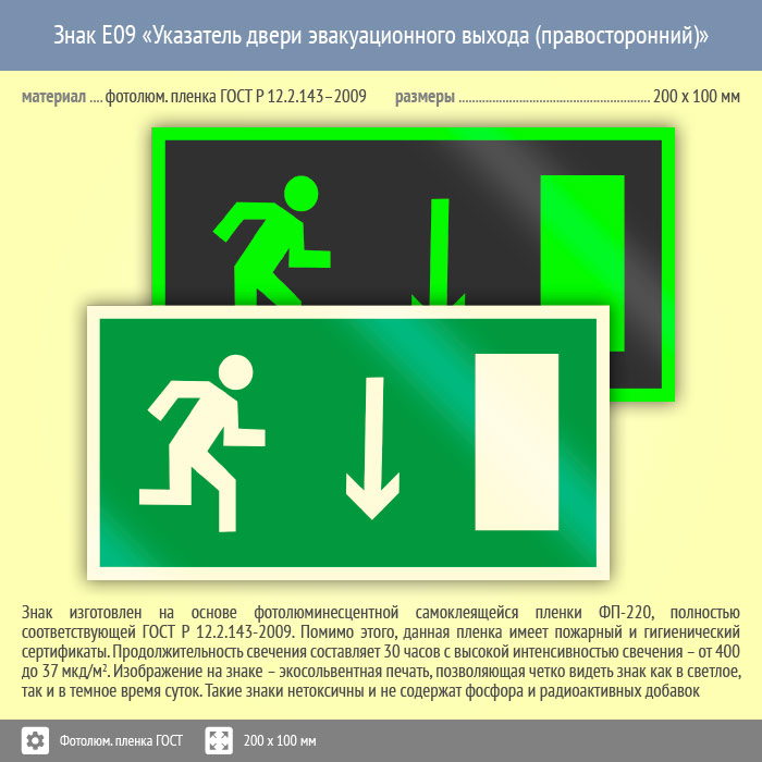 Знак E09 «Указатель двери эвакуационного выхода (правосторонний)» (фотолюминесцентная пленка ГОСТ 34428-2018, 200х100 мм) в Химках купить