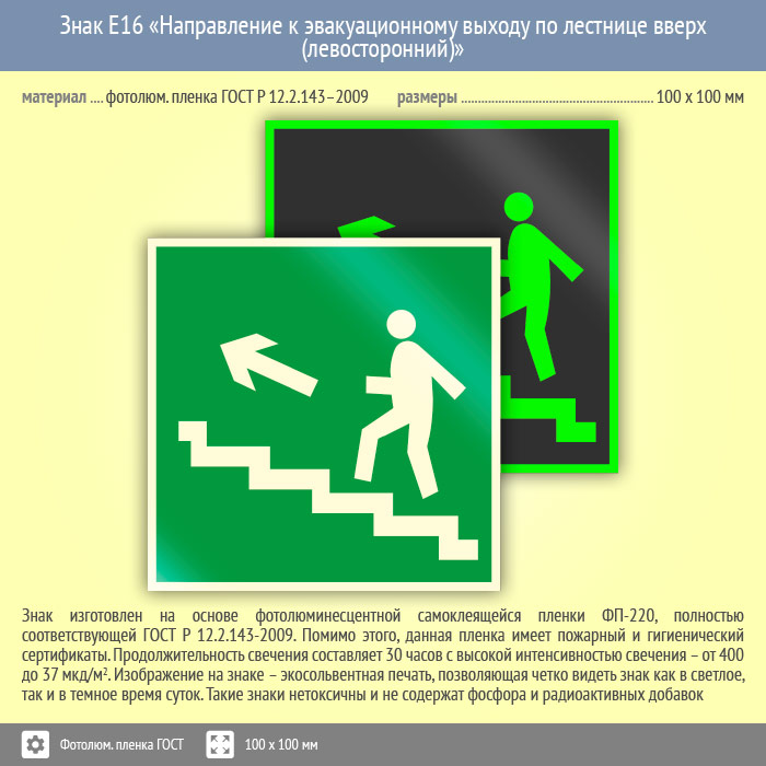 Знак E16 «Направление к эвакуационному выходу по лестнице вверх (левосторонний)» (фотолюминесцентная пленка ГОСТ 34428-2018, 100х100 мм) в Химках купить