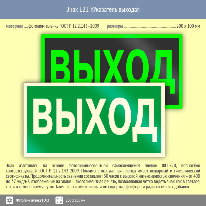 Знак E22 «Указатель выхода» (фотолюминесцентная пленка ГОСТ 34428-2018, 200х100 мм) в Химках купить