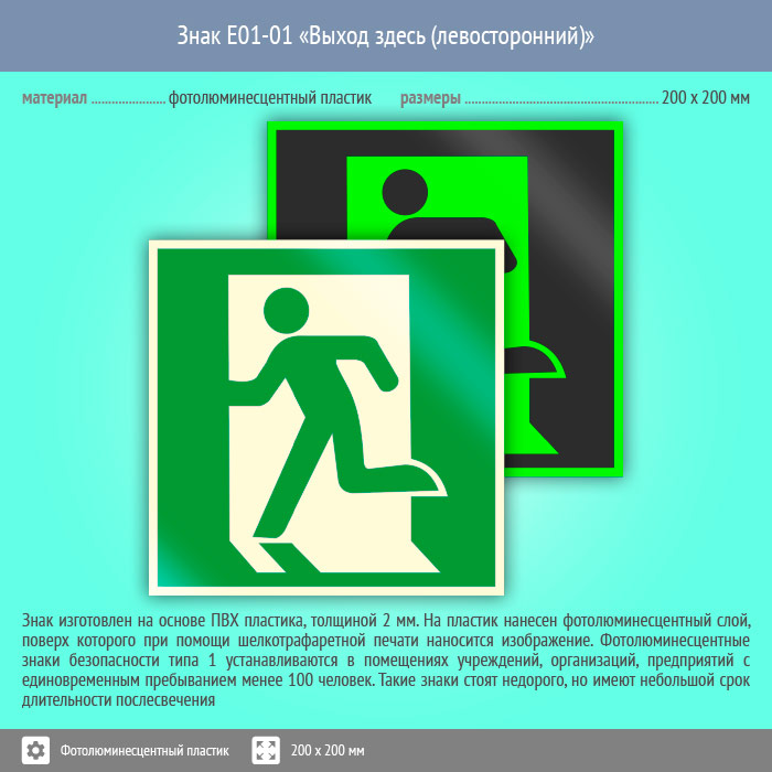 Знак E01-01 «Выход здесь (левосторонний)» (фотолюминесцентный пластик, 200х200 мм) в Химках купить