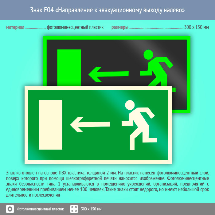 Знак E04 «Направление к эвакуационному выходу налево» (фотолюминесцентный пластик, 300х150 мм) в Химках купить