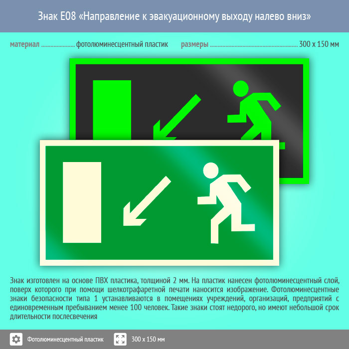 Знак E08 «Направление к эвакуационному выходу налево вниз» (фотолюминесцентный пластик, 300х150 мм) в Химках купить