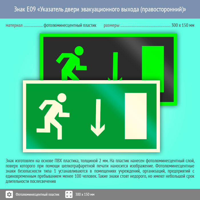 Знак E09 «Указатель двери эвакуационного выхода (правосторонний)» (фотолюминесцентный пластик, 300х150 мм) в Химках купить