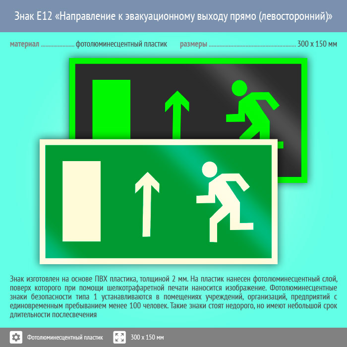 Знак E12 «Направление к эвакуационному выходу прямо (левосторонний)» (фотолюминесцентный пластик, 300х150 мм) в Химках купить