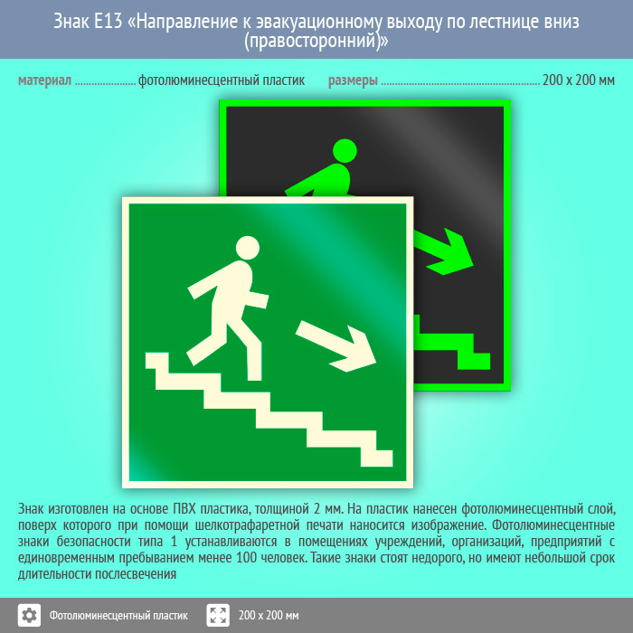 Знак E13 «Направление к эвакуационному выходу по лестнице вниз (правосторонний)» (фотолюминесцентный пластик, 200х200 мм) в Химках купить