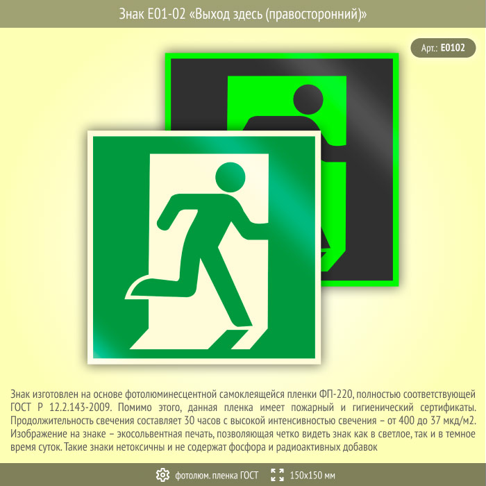 Знак E01-02 «Выход здесь (правосторонний)» (фотолюминесцентная пленка ГОСТ 34428-2018, 150х150 мм) в Химках купить