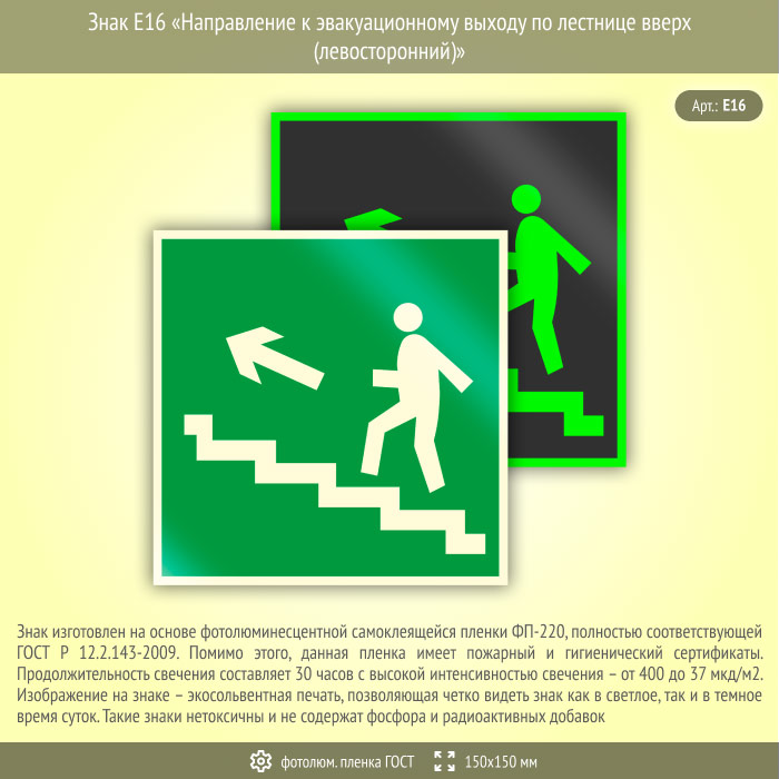 Знак E16 «Направление к эвакуационному выходу по лестнице вверх (левосторонний)» (фотолюминесцентная пленка ГОСТ 34428-2018, 150х150 мм) в Химках купить