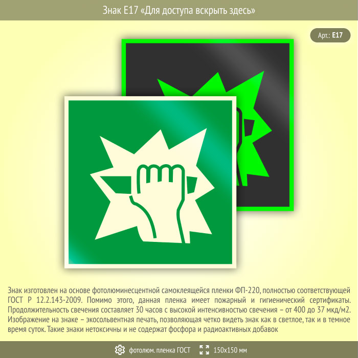 Знак E17 «Для доступа вскрыть здесь» (фотолюминесцентная пленка ГОСТ 34428-2018, 150х150 мм) в Химках купить