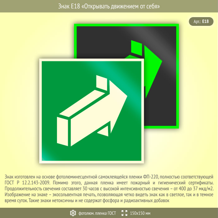 Знак E18 «Открывать движением от себя» (фотолюминесцентная пленка ГОСТ 34428-2018, 150х150 мм) в Химках купить