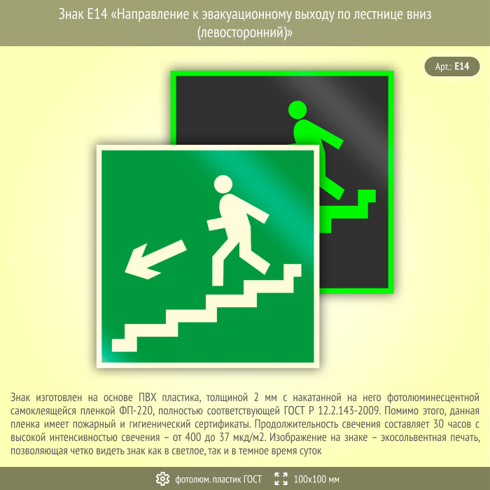 Знак E14 «Направление к эвакуационному выходу по лестнице вниз (левосторонний)» (фотолюминесцентный пластик ГОСТ 34428-2018, 100х100 мм) в Химках купить