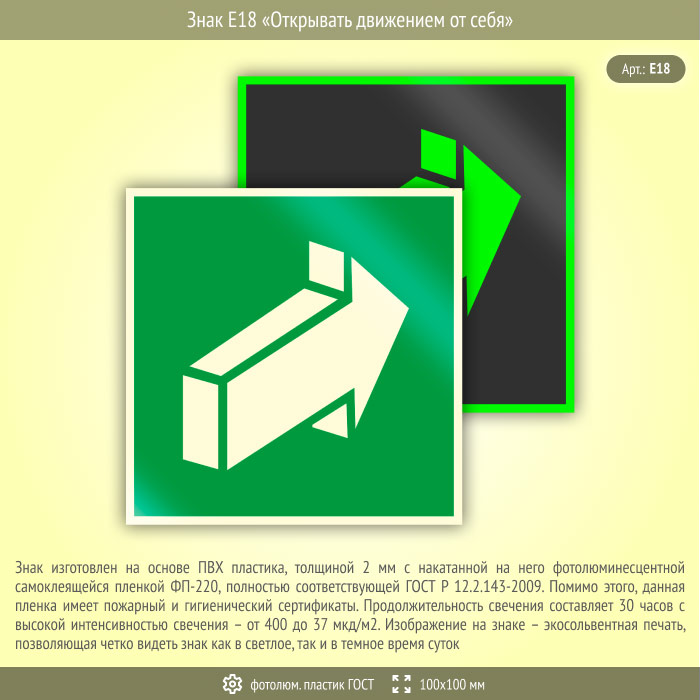 Знак E18 «Открывать движением от себя» (фотолюминесцентный пластик ГОСТ 34428-2018, 100х100 мм) в Химках купить
