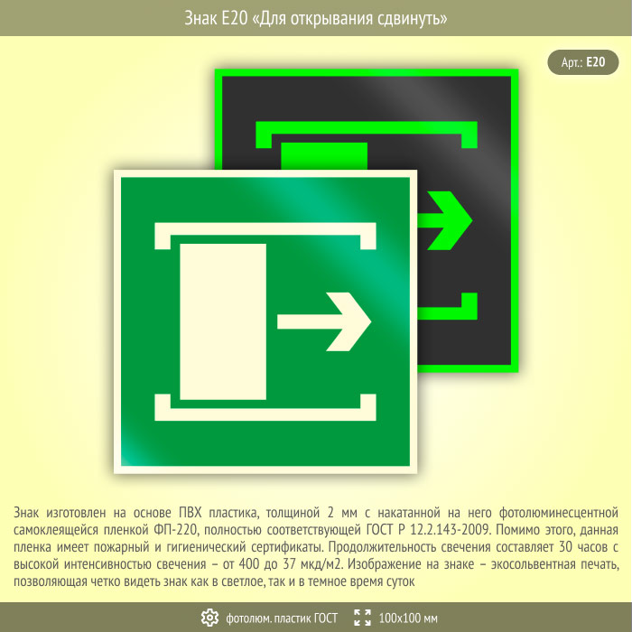 Знак E20 «Для открывания сдвинуть» (фотолюминесцентный пластик ГОСТ 34428-2018, 100х100 мм) в Химках купить