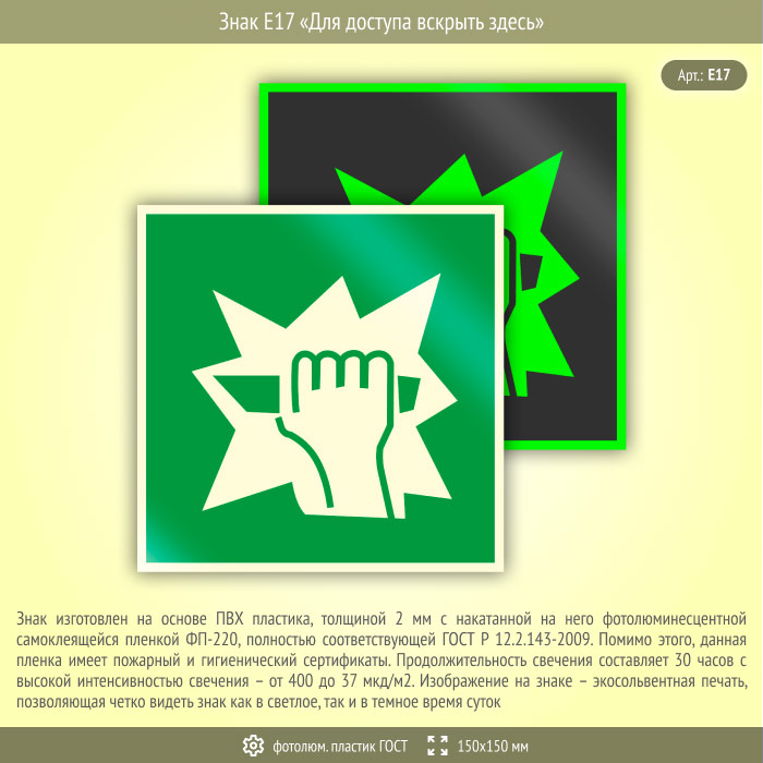 Знак E17 «Для доступа вскрыть здесь» (фотолюминесцентный пластик ГОСТ 34428-2018, 150х150 мм) в Химках купить