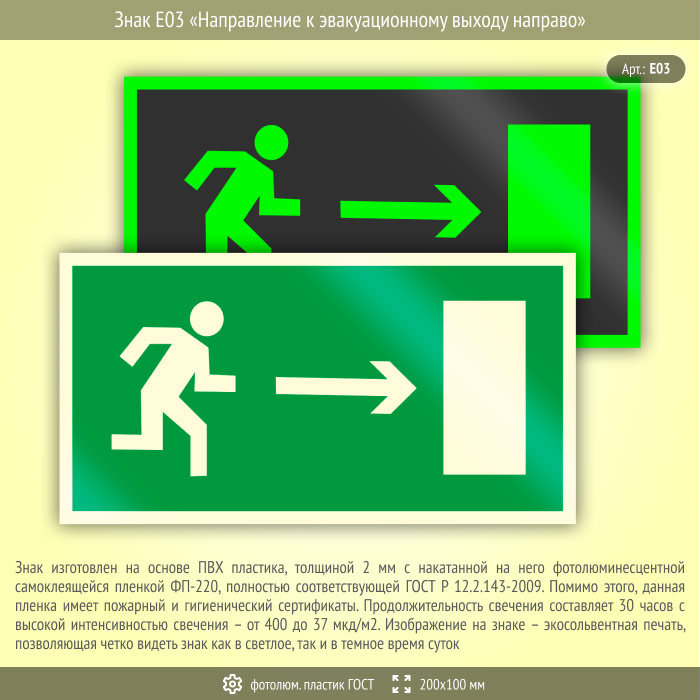 Знак E03 «Направление к эвакуационному выходу направо» (фотолюминесцентный пластик ГОСТ 34428-2018, 200х100 мм) в Химках купить