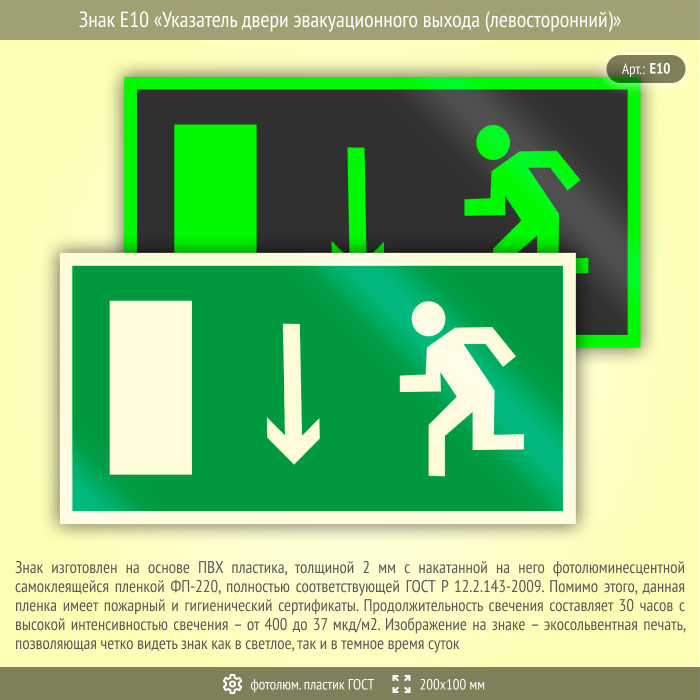 Знак E10 «Указатель двери эвакуационного выхода (левосторонний)» (фотолюминесцентный пластик ГОСТ 34428-2018, 200х100 мм) в Химках купить