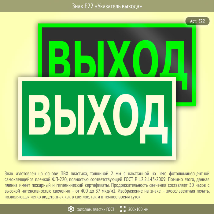 Знак E22 «Указатель выхода» (фотолюминесцентный пластик ГОСТ 34428-2018, 200х100 мм) в Химках купить