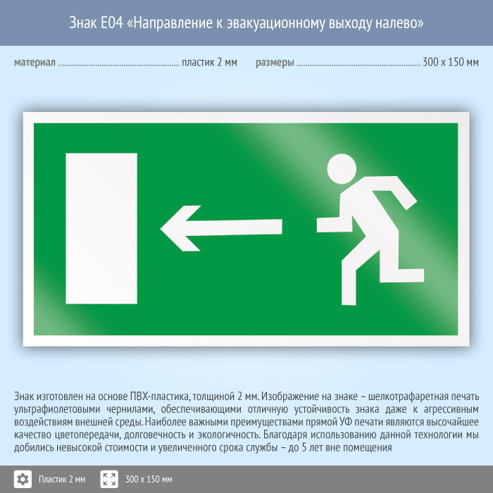 Знак E04 «Направление к эвакуационному выходу налево» (пластик, 300х150 мм) в Химках купить