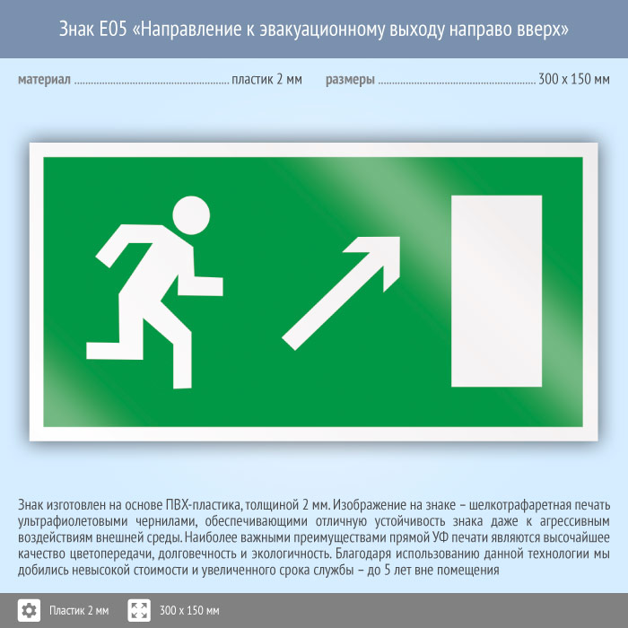 Знак E05 «Направление к эвакуационному выходу направо вверх» (пластик, 300х150 мм) в Химках купить