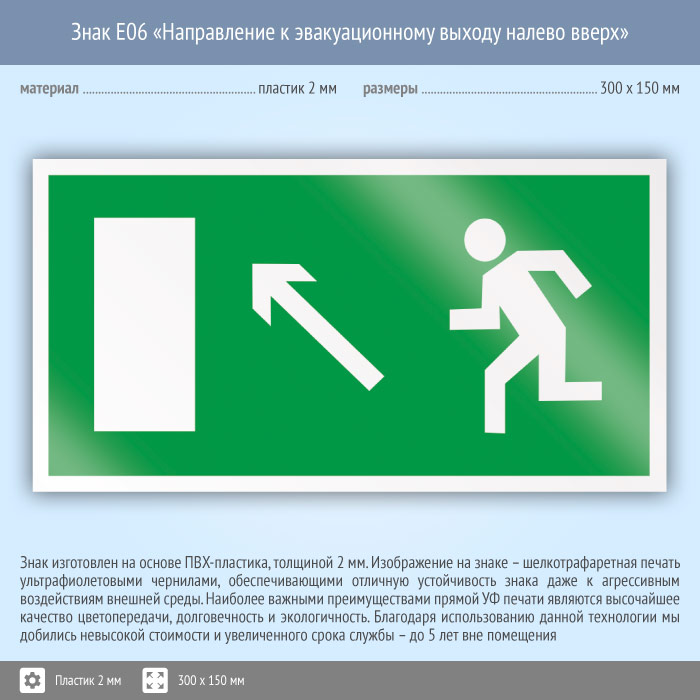 Знак E06 «Направление к эвакуационному выходу налево вверх» (пластик, 300х150 мм) в Химках купить
