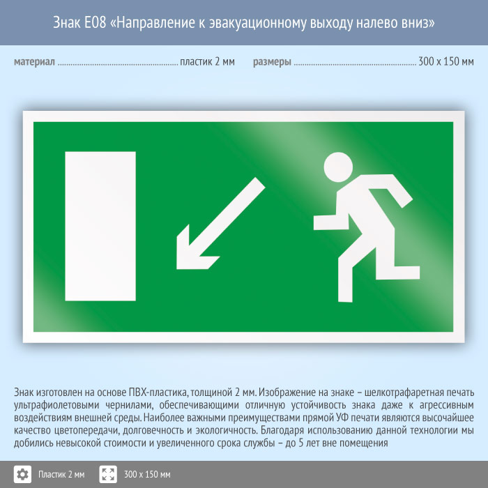 Знак E08 «Направление к эвакуационному выходу налево вниз» (пластик, 300х150 мм) в Химках купить
