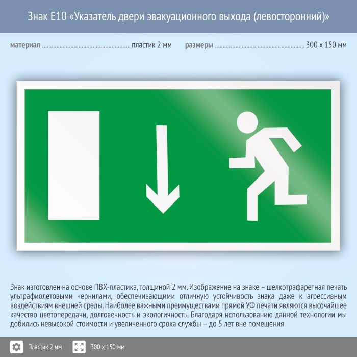 Знак E10 «Указатель двери эвакуационного выхода (левосторонний)» (пластик, 300х150 мм) в Химках купить