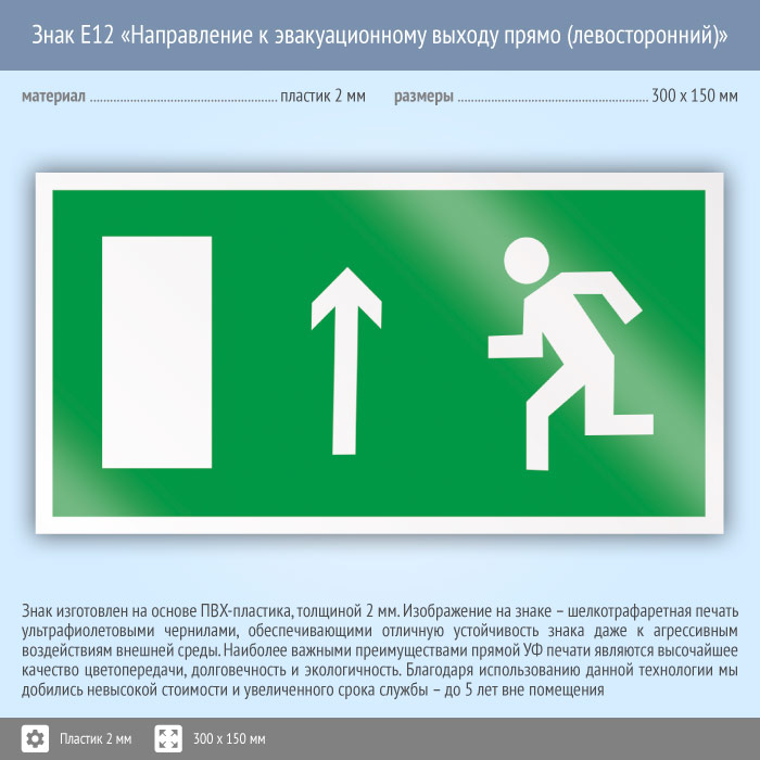 Знак E12 «Направление к эвакуационному выходу прямо (левосторонний)» (пластик, 300х150 мм) в Химках купить