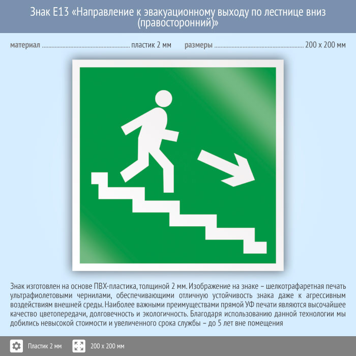 Знак E13 «Направление к эвакуационному выходу по лестнице вниз (правосторонний)» (пластик, 200х200 мм) в Химках купить