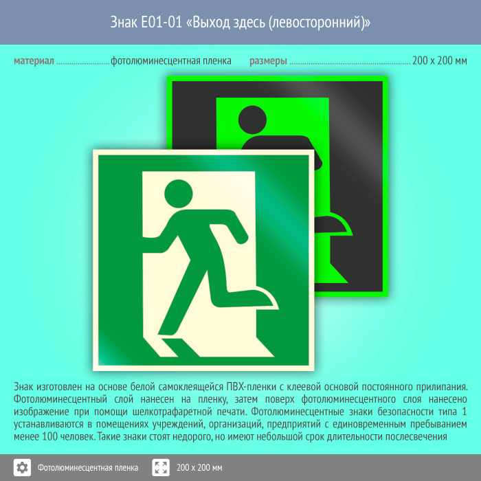 Знак E01-01 «Выход здесь (левосторонний)» (фотолюминесцентная пленка, 200х200 мм) в Химках купить