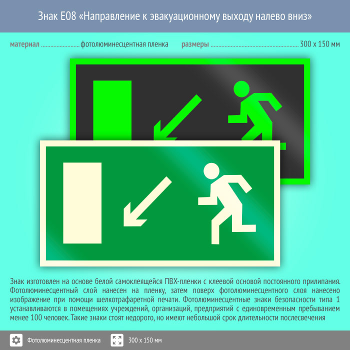 Знак E08 «Направление к эвакуационному выходу налево вниз» (фотолюминесцентная пленка, 300х150 мм) в Химках купить