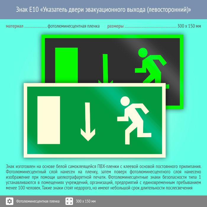 Знак E10 «Указатель двери эвакуационного выхода (левосторонний)» (фотолюминесцентная пленка, 300х150 мм) в Химках купить