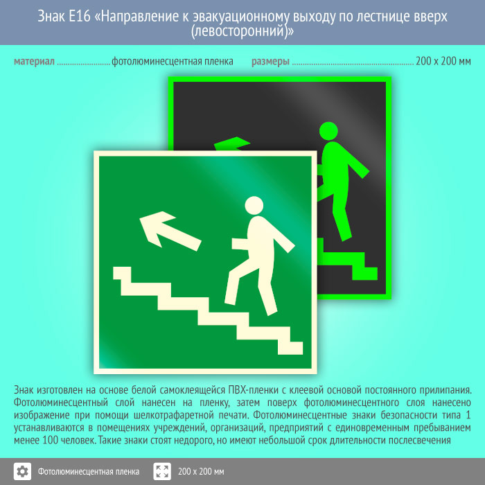 Знак E16 «Направление к эвакуационному выходу по лестнице вверх (левосторонний)» (фотолюминесцентная пленка, 200х200 мм) в Химках купить