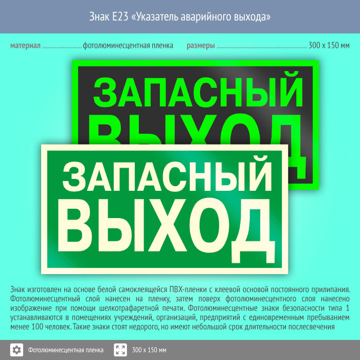 Знак E23 «Указатель запасного выхода» (устаревший) (фотолюминесцентная пленка, 300х150 мм) в Химках купить