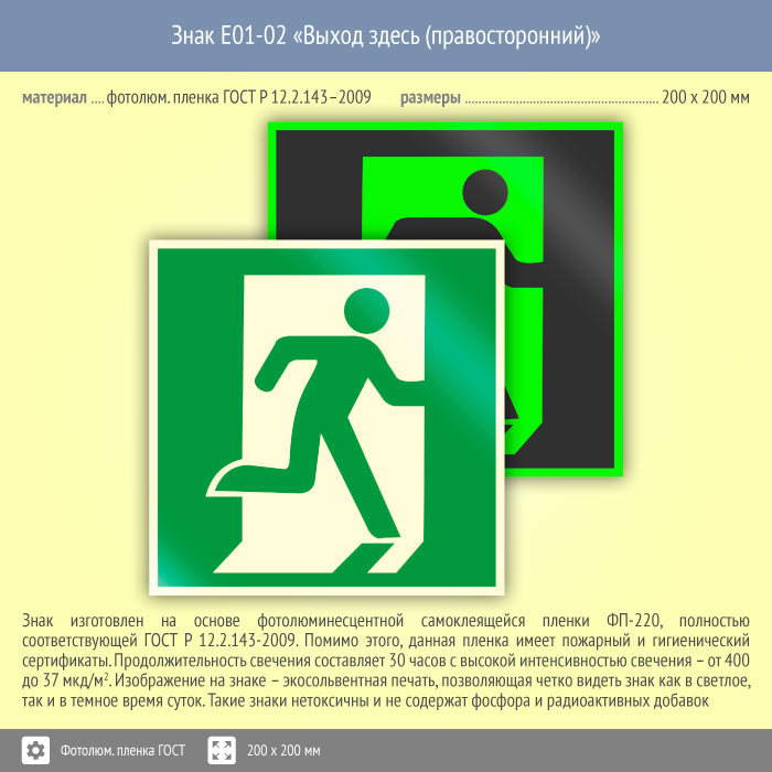 Знак E01-02 «Выход здесь (правосторонний)» (фотолюминесцентная пленка ГОСТ 34428-2018, 200х200 мм) в Химках купить
